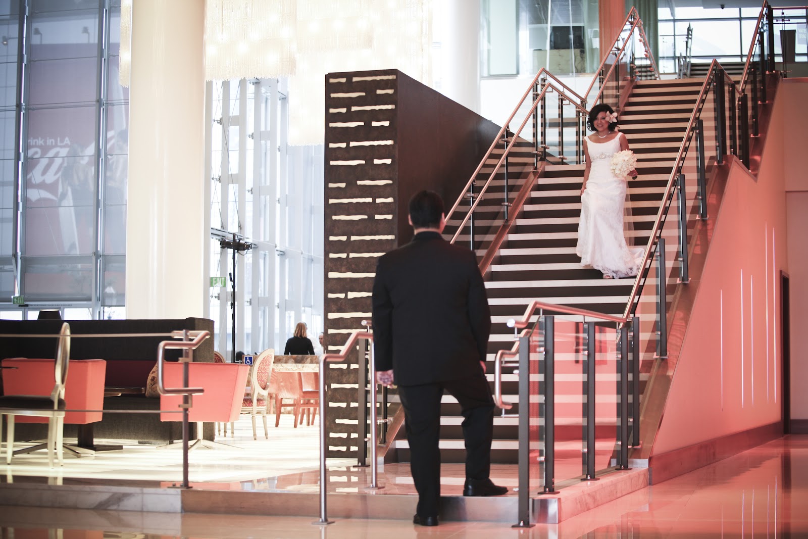I am doing this wedding in a 2 Part Blog because the venues were simply fantastic! There are too many images I want to show so I will start with the first half of the wedding of Valorie and Kenneth recently wed in Downtown Los Angeles, and their reception followed in Beverly Hills. We started their “Getting Ready” pictures at the Fabulous JW Marriot LIVE right in the heart of Downtown LA. Their wedding happened to be the morning of the LA Marathon which was really cool walking to the hotel as the racers were running right by the hotel. The lobby of this hotel was perfect for the couples first glance. They wanted to see each other before the wedding so that they could get plenty of great romantics, and to allow the timeline to run a little smoother. It makes for a great wedding day when the couple see’s each other ahead of time for more than one reason. Below you can also see that the bride was still full of tears while walking down the isle and the moment is not taken away from and still incredibly meaningful. This cute couple decided to not have a bridal party, which I have blogged about before, I simply LOVE it! It just seems like the day is more about the couple when there is no bridal party and is so much simpler and enjoyable for the couple. Enjoy this LA wedding and watch for part 2 of this blog which will showcase more romantics, details, and their gorgeous wedding reception at Lawry’s in Beverly Hills. Joanna Chong with www.jsoiree-events.com did a fabulous job coordinating this wedding and she was fun and very easy and flexible to work with, she really took care of my assistant and I. Jay with the DJ Company will also be featured in the next blog!