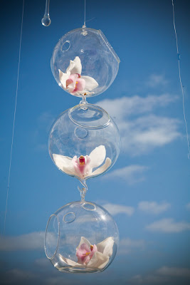 The designer used glass stands, and hung the tier dropped glass globes with orchids inside. The flowers were gorgeous, and so was the ceremony site!