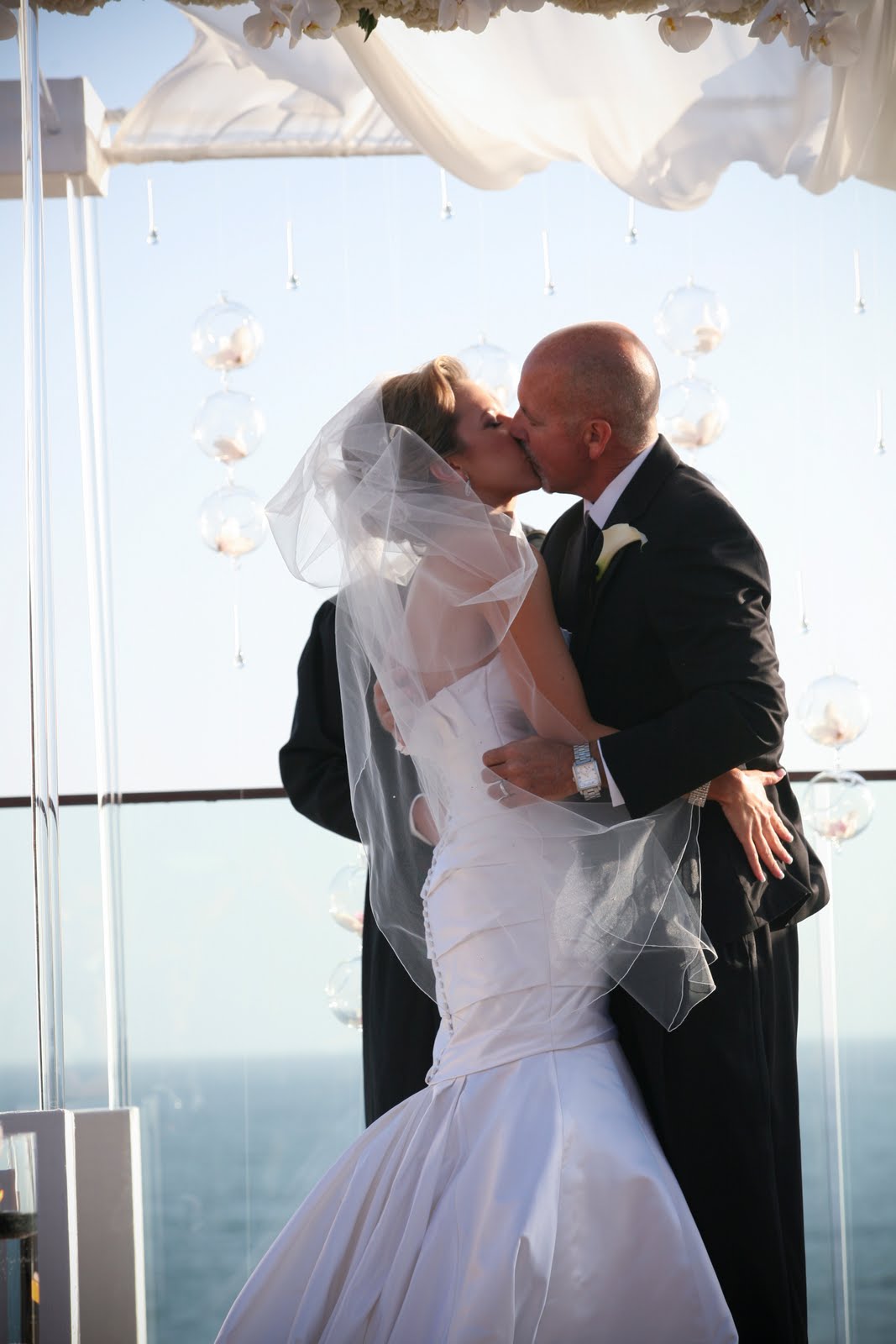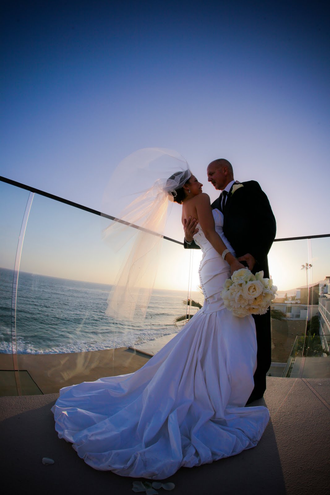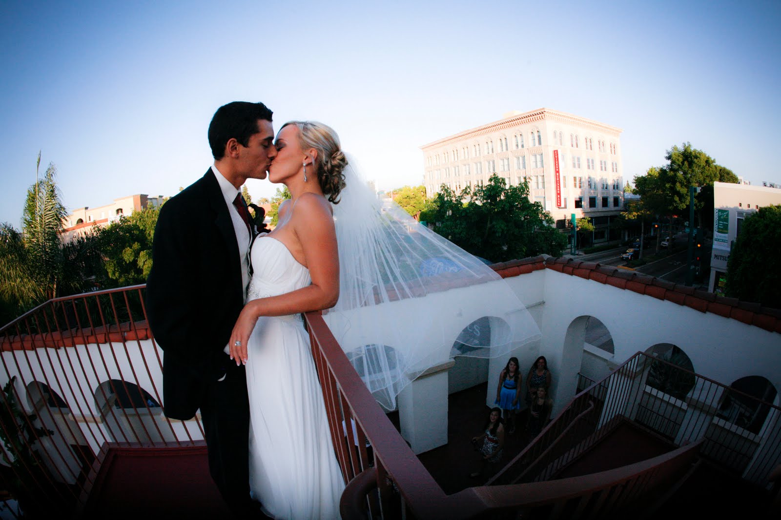 Bride overlooking her wedding reception from the 2nd story of Villa Del Sol. Love the California behind her, really showcases the venue and a beautiful California wedding!